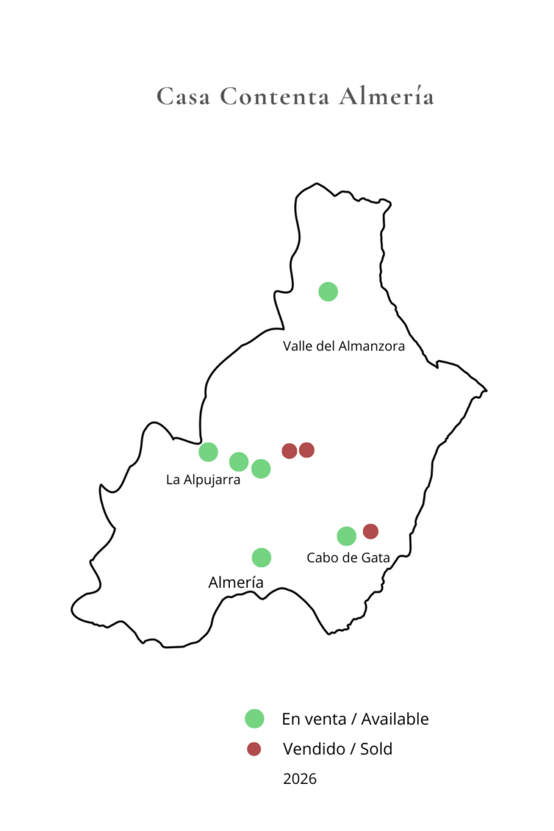 Des petits hôtels ruraux, des projets de cohabitation, des villas, des maisons de village, des cortijos simples ou de grandes fincas : chacune a sa propre personnalité.
